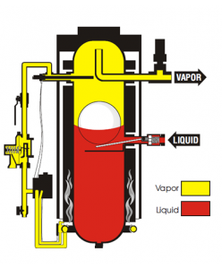 The RH Series vaporizer consists of a vertical ASME rated pressure vessel which is directly heated by a gas fired burner. The burner consumes a small portion of vapor from the vessel to develop the heat required for vaporization. As liquid enters the vessel, it begins to vaporize as heat is absorbed from the warm heat exchanger. This causes the vapor temperature to decrease. The operating temperature switch monitors vapor temperature and signals the gas control valve to fire the burner when vapor temperature drops below set point (120 degree F). Ransome Models RH50 thru RH120 use a mechanical liquid level control system that consists of a mechanical inlet valve, which is actuated by a stainless steel ball located inside the vessel. If the liquid level rises above the desired level, the float will lift off the inlet valve lever allowing it to to close, preventing a liquid carryover. Once the level drops, the inlet valve will re-open. Ransome Models RH200 thru RH1000 use an electrically operated liquid level control system which consists of an external float switch and solenoid valve. If the liquid rises above the desired level, the float will close the solenoid valve to prevent a liquid carryover.